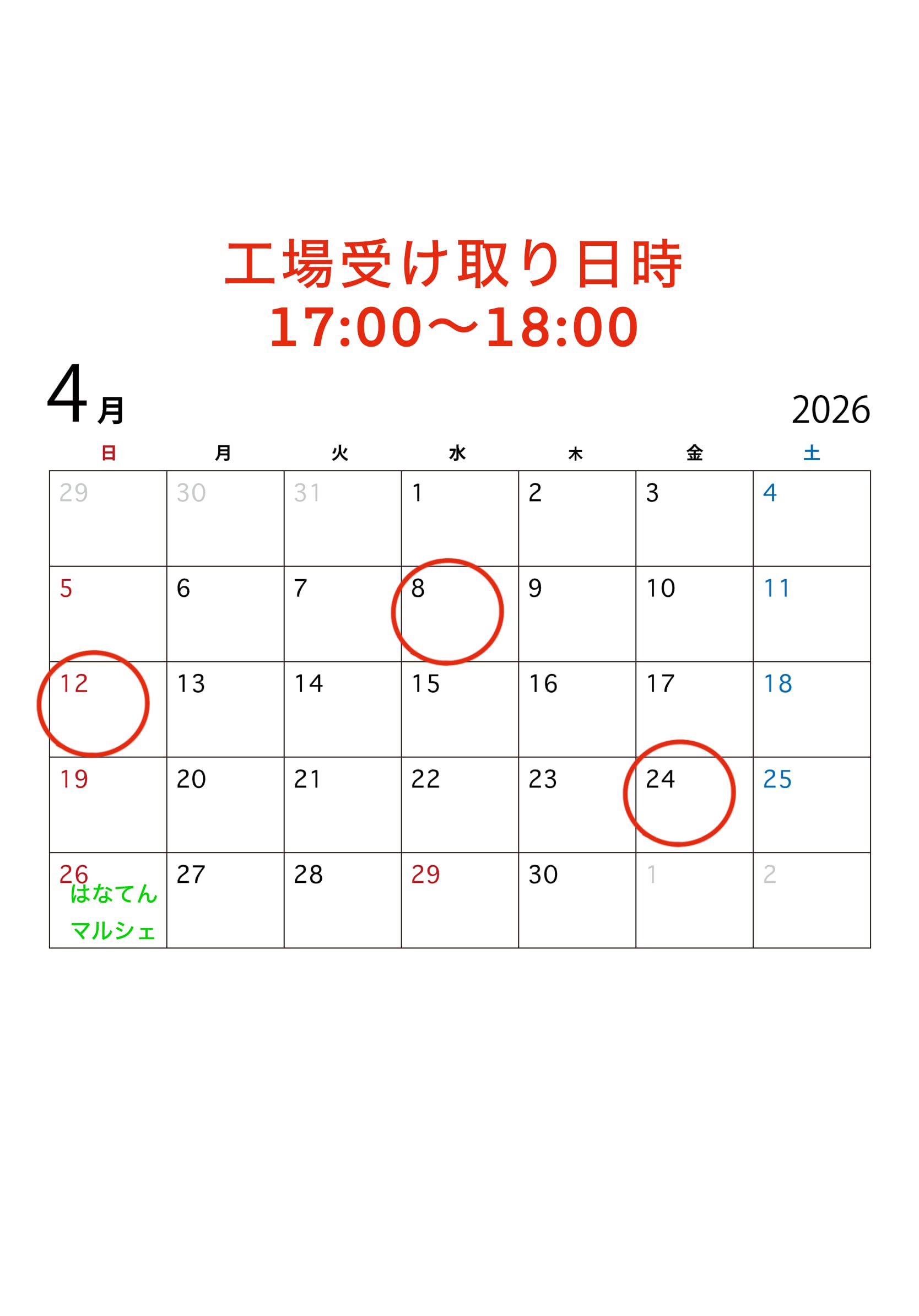 ・受け取り日(カレンダー参照ください).